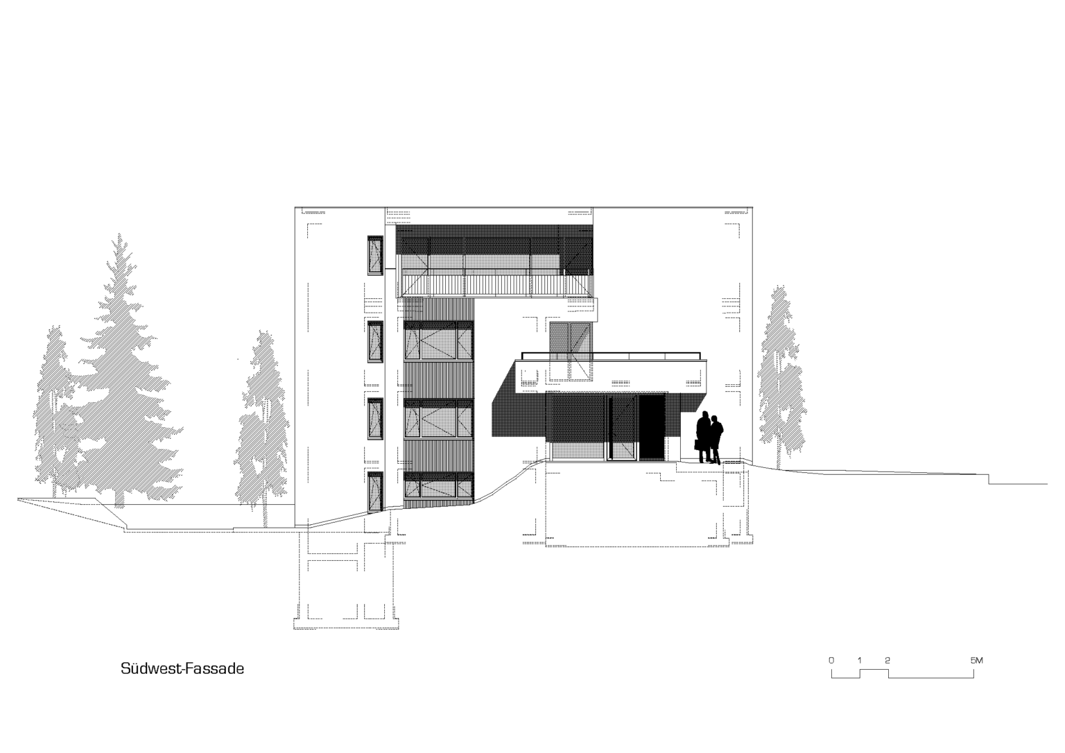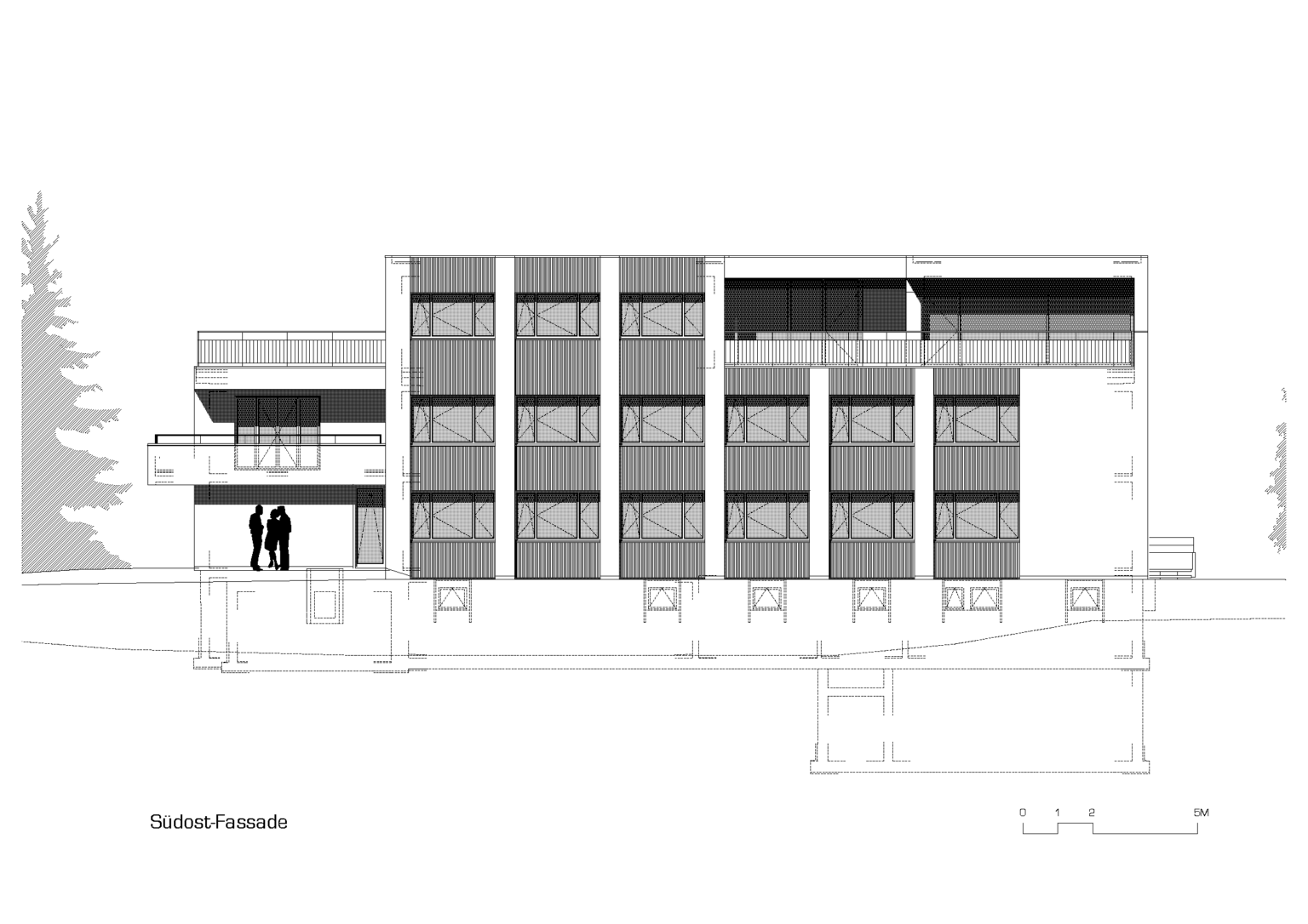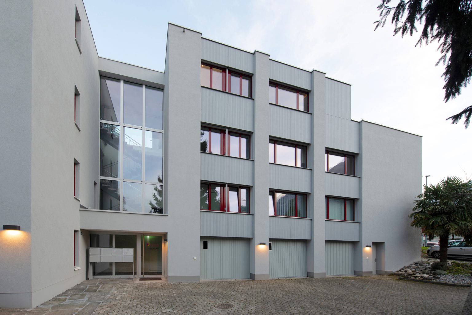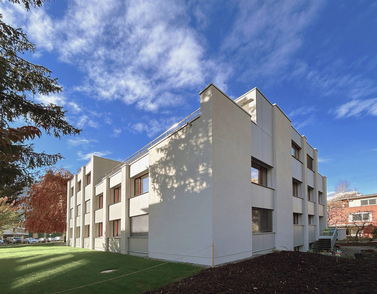 Das Haus hat eine DNA, welche sich massgeblich in der Vertikalität der Fassadenlisenen, zurückspringenden Fensterpartien und zeilenförmigen Anordnung der Raumzonen und Erschliessungen wiederspiegelt. Der Entwurf respektiert die bestehenden Fassaden- und Grundrissstrukturen aus der Bauzeit von 1974 und appliziert diese in der Aufstockung. Grossformatige und kannelurenartige Eternitplatten verstärken diese Thematik und stehen im Wechselspiel zum feinkörnigem Negativfassadenabrieb. Aus der Bauzeit vorhandene Materialien und Farben, wie beispielsweise die mit Urner Flusskies durchmischten Kunststeinbodenbeläge des Treppenhauses oder die purpurroten Fensterrähmen fanden in der Aufstockung ihre Wiederverwendung. Da die oberste Decke nur Netzarmiert und keine statischen Funktionen erfüllen konnte, erfolgte der Lastabtrag des Holzelementbaus ausschliesslich mit Vollholzböden und -decken auf die darunterliegenden Innenwände. Dank dem Einbau eines Liftkerns wurden zusätzliche, statische Verstärkungsziele erreicht. Mit der neuen, eingebauten Grundwasserwärmepumpe sowie der PV-Anlage auf dem Dach konnte der CO2-Austoss erheblich reduziert sowie dank Eigenproduktion nahezu 80% des Energiebedarfs selbst erzeugt werden – eine nachhaltige Bauweise, welche mit Fördergeldern unterstützt wurde.