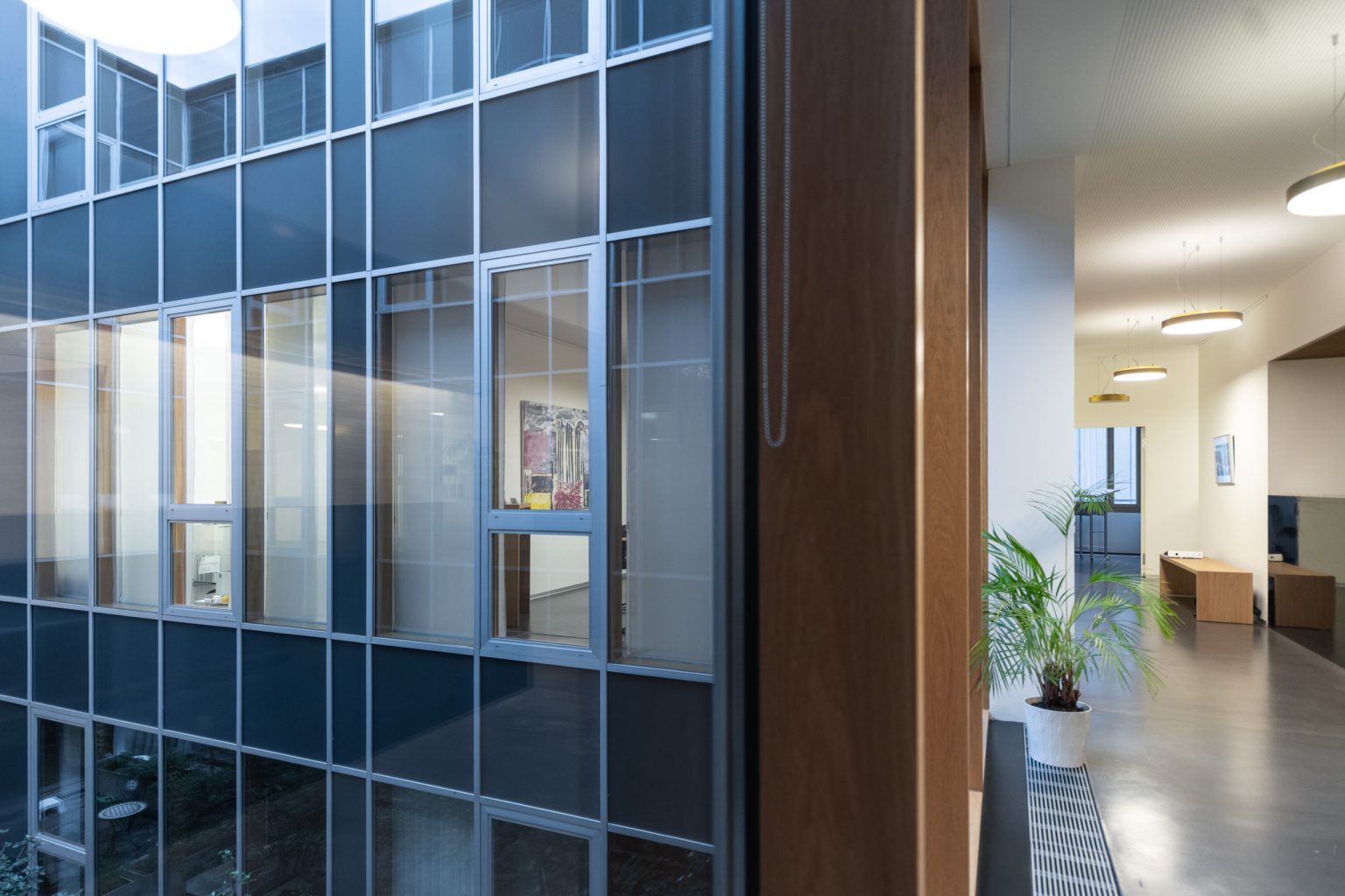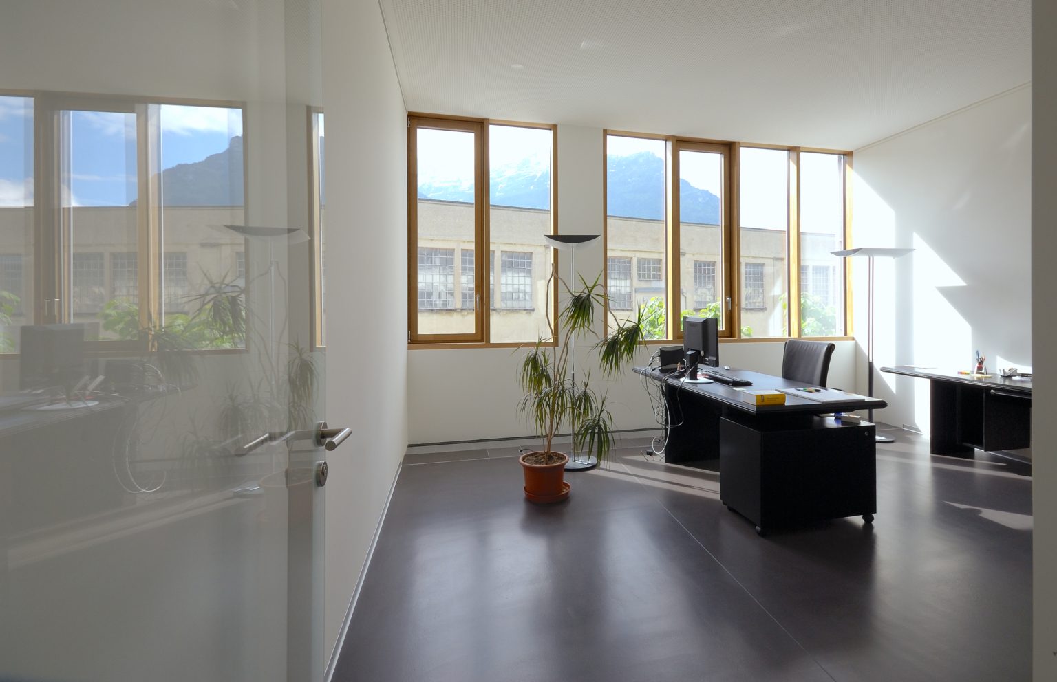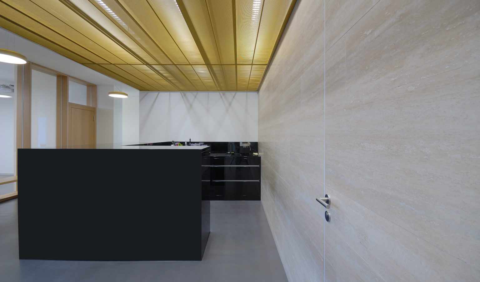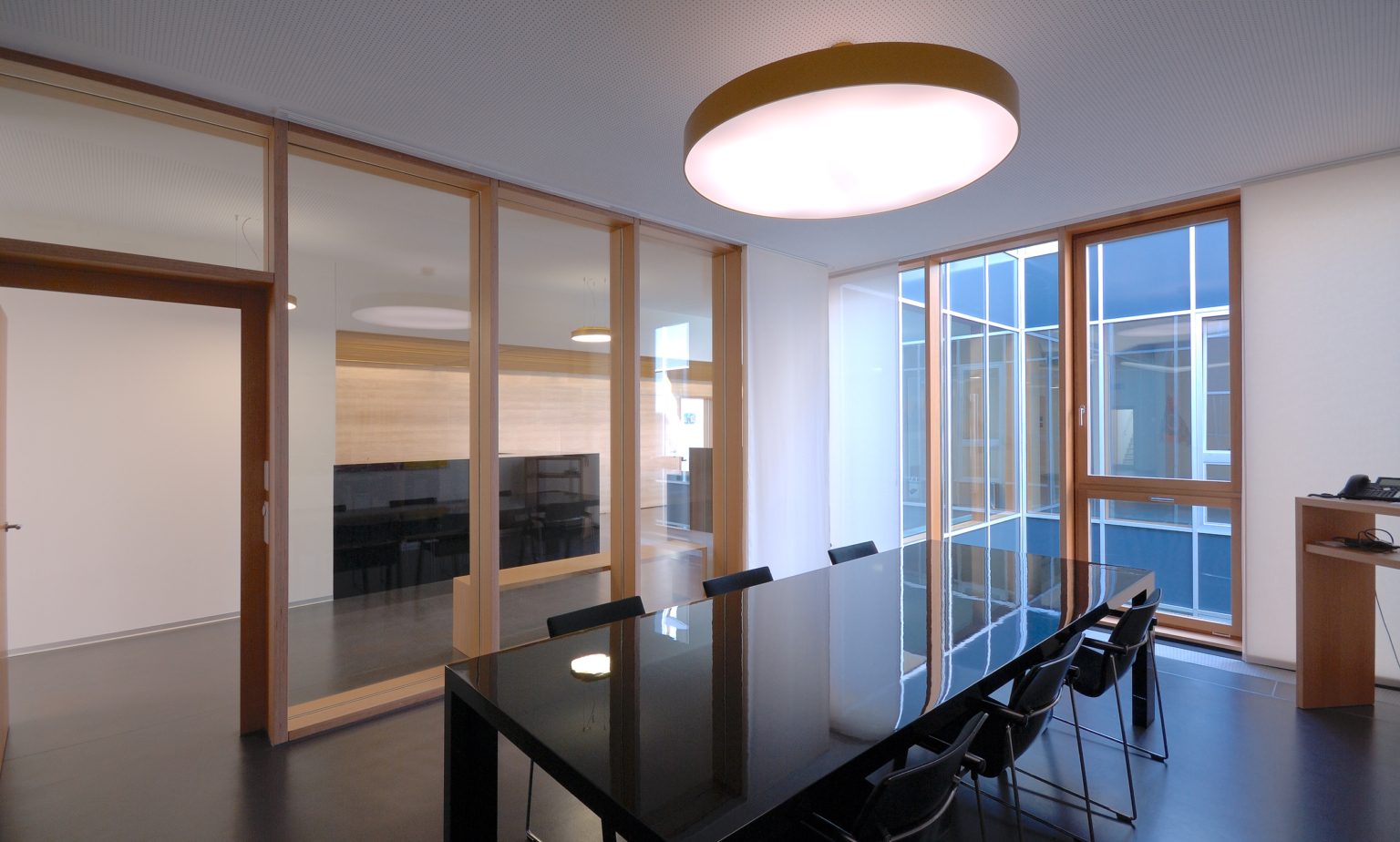 Die ehemaligen Produktionsräume der Bodenbelagsfabrik der Dätwyler AG bildeten die Grundlage für den Einbau eines Rechtsanwalts- und Notariatsbüros. Inmitten des Gevierts wurde ein Lichthof ausgespart. Die bestehenden Stützenraster, Unterzüge sowie Raumhöhen bis zu 340 cm waren massgeblich verantwortlich für die Struktur und Grösse der Raumzonen. Um einen zentralen Eingangsbereich und Korridor gruppieren sich Besprechungszimmer, Büros und eine Eingangstheke mit Cafébar. Der Deckenhorizont darüber wurde leicht abgesetzt, so dass eine wahrnehmbare Zonierung stattfindet. Ein feinmaschiges und goldfarbiges Netz filtriert das Kunstlicht und erzeugt eine samtfarbige Illuminierung. Diese stehen in Kontext zur rückseitigen Wandfront aus Travertinplatten und schwarzen, mattlackierten Möblierungen. Partielle neue Pfostenriegelkonstruktionen aus Eichenholz nehmen Bezug in Materialisierung und Grösse zum Bestand. Ein homogener, durchgefärbter Fliessbelag führt durch sämtliche Räume. Rosa- und Blaufarbtöne bestimmen das Farbkonzept zu den WC-Anlagen. Insgesamt umfasst der Einbau 11 Raumeinheiten.