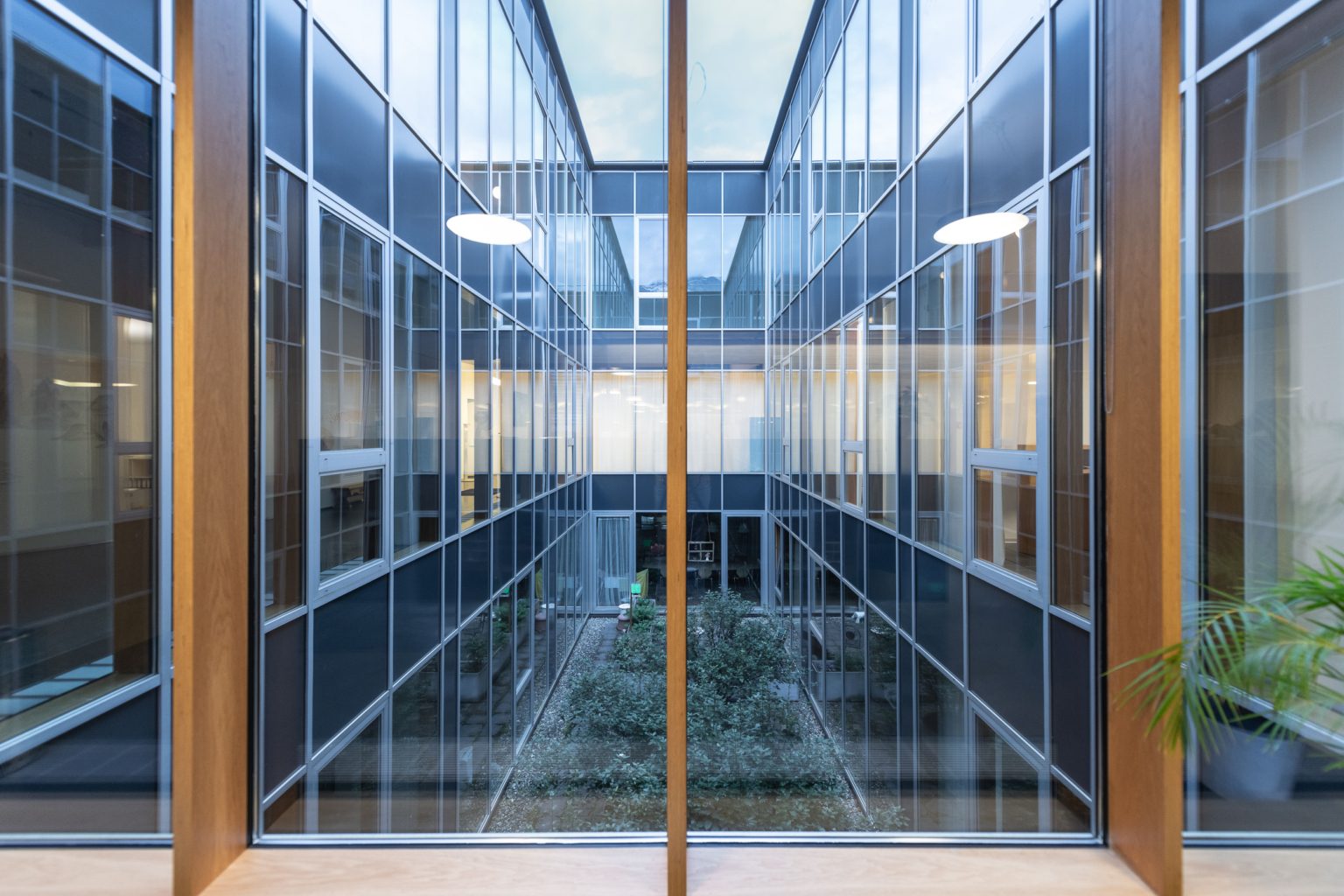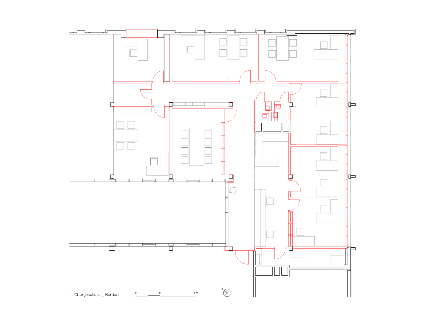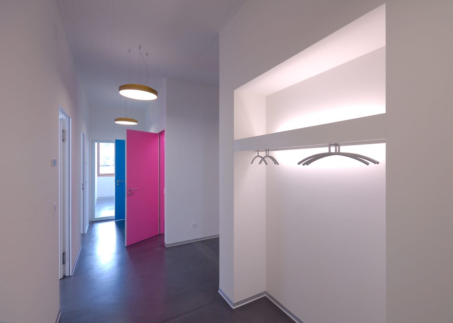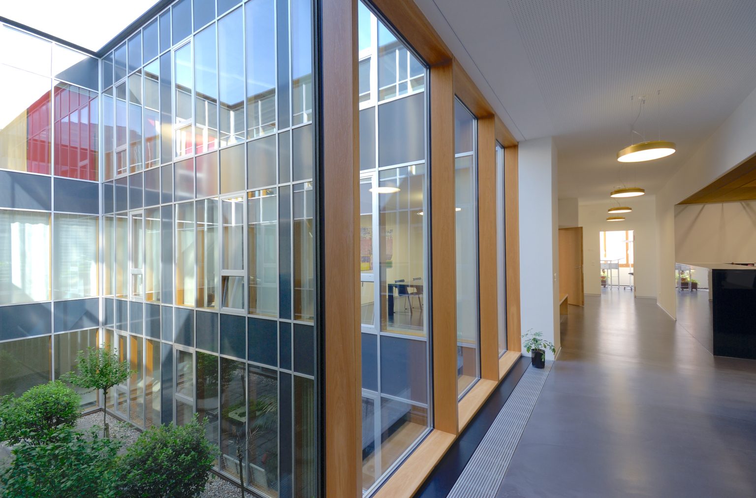 Die ehemaligen Produktionsräume der Bodenbelagsfabrik der Dätwyler AG bildeten die Grundlage für den Einbau eines Rechtsanwalts- und Notariatsbüros. Inmitten des Gevierts wurde ein Lichthof ausgespart. Die bestehenden Stützenraster, Unterzüge sowie Raumhöhen bis zu 340 cm waren massgeblich verantwortlich für die Struktur und Grösse der Raumzonen. Um einen zentralen Eingangsbereich und Korridor gruppieren sich Besprechungszimmer, Büros und eine Eingangstheke mit Cafébar. Der Deckenhorizont darüber wurde leicht abgesetzt, so dass eine wahrnehmbare Zonierung stattfindet. Ein feinmaschiges und goldfarbiges Netz filtriert das Kunstlicht und erzeugt eine samtfarbige Illuminierung. Diese stehen in Kontext zur rückseitigen Wandfront aus Travertinplatten und schwarzen, mattlackierten Möblierungen. Partielle neue Pfostenriegelkonstruktionen aus Eichenholz nehmen Bezug in Materialisierung und Grösse zum Bestand. Ein homogener, durchgefärbter Fliessbelag führt durch sämtliche Räume. Rosa- und Blaufarbtöne bestimmen das Farbkonzept zu den WC-Anlagen. Insgesamt umfasst der Einbau 11 Raumeinheiten.